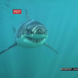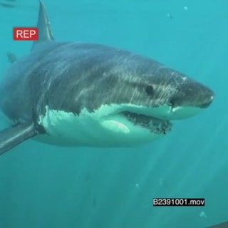 Select options DownloadGreat white shark gently swimming towards camera underwater in ocean then bumping it and passing by UW HAND