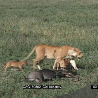 Select options DownloadAfrican Lioness with cubs walking on bushveld investigating dead Blue Wildebeest then passing by LWS ZI MLS