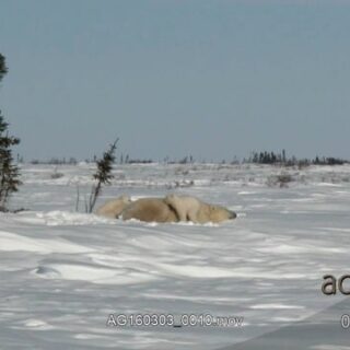 Adult female Polar Bear laying down, sleeping and her cubs digging, playing around.