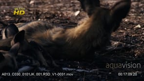 Pack of young African Wild Dog pubs laying down, resting, sleeping and some looking around, MCU;PAN;DAY