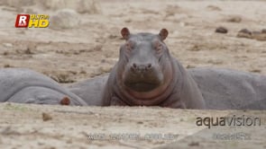 Two adult Hippo laying, resting and a young bit sleepy while looking towards the camera. MCU.