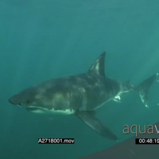 Great White Shark gently swimming underwater in ocean passing by school of Strepies and camera MLS TU PAN HAND