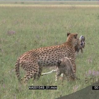 Cheetah Cub Walking up to Adult Cheetah Suffocating Springbok Kill on grassland DRY AmCam