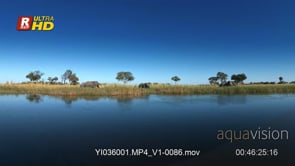 Select options DownloadOkavango delta floods on a sunny day and four adult African Elephant general behaviour display, PAN.