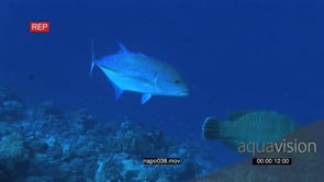 Humphead Wrasse and Bluefin Kingfish swimming and turning on coral reef underwater in ocean MLS PAN HAND