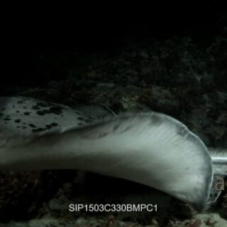 A night hunting giant reef stingray swims into frame from the side landing on the coral in front of the camera while swishing its tail in the lens then swims away again