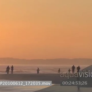 People walking on beach in orange sunset light