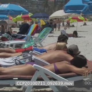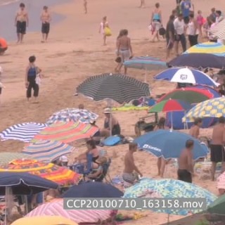 Ocean zoom out to beach with people under umbrella's general behaviour