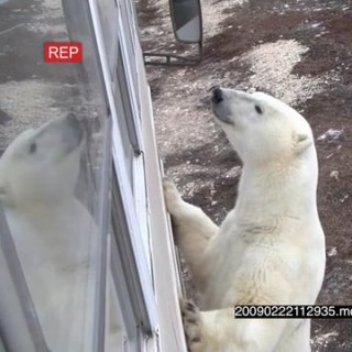 Tourists inside tour bus taking pictures of Polar bear investigating vehicle outside reflection on window