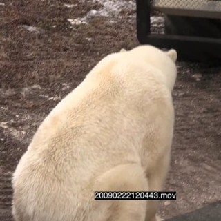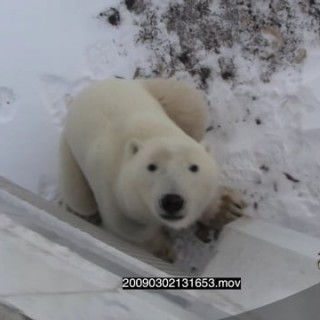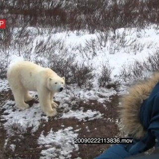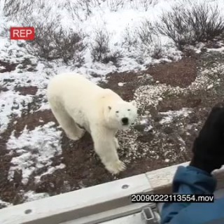 Polar bear scouting around Tourist takes pictures from inside tour bus
