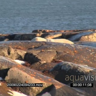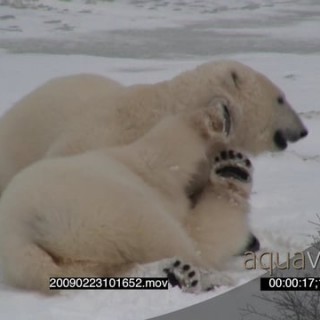 Pair of polar bears walking from different directions towards each other laying down aggressive behaviour digging snow