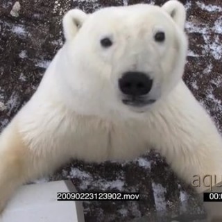 Polar bear sitting looking up at Tourists taking pictures from inside Tour bus