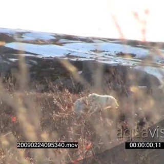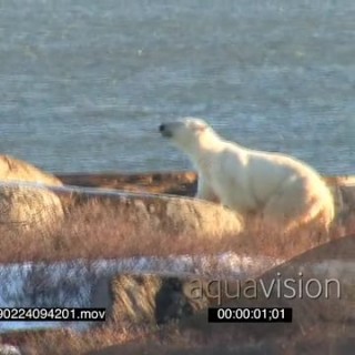 Animal Conservation officer following chasing shooting towards Polar bear running away in the distance towards ocean