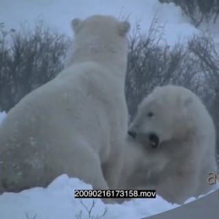 Pair of polar bears chasing each other around on frozen lake aggressive behaviour
