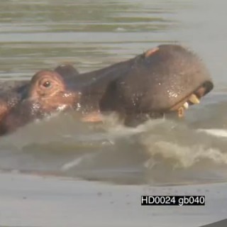 Hippos agitated intimidation behaviour attempting to fight Nile Crocodile looking on Great White Egret cautiously enter river