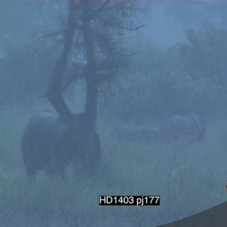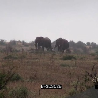 African Elephant with calfs in BG grazing standing in Rainstorm