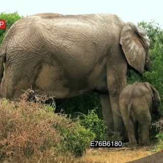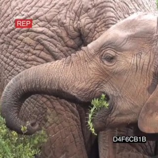 Young African elephant feeding on bushes adults standing nearby in rainy weather