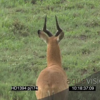 Puku standing facing away from Cam scouting around in rain Cut Aways rain falling on ground and leaves