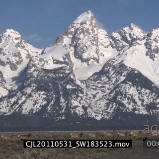 Herds of Bisons and Elks walking and grazing on prairie with snowy mountains in background XWS