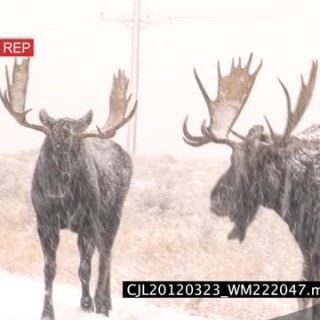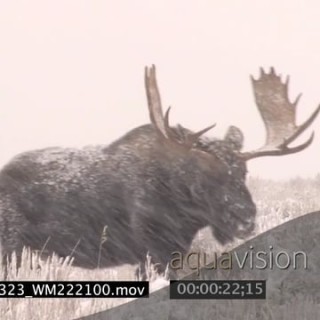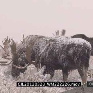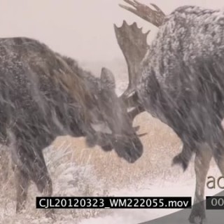 Mooses fighting on prairie during snowfall then one walking away 2S LS