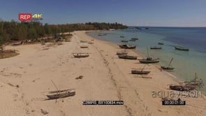 AERIAL of the Madagascar Island with fishers preparing to go for fishing and a boat sailing with people enjoying the ride GOOD LIGHT