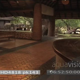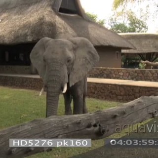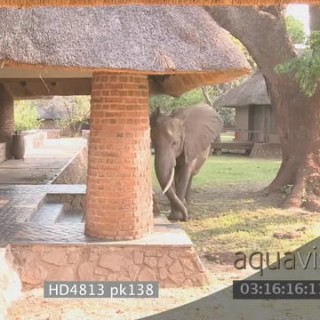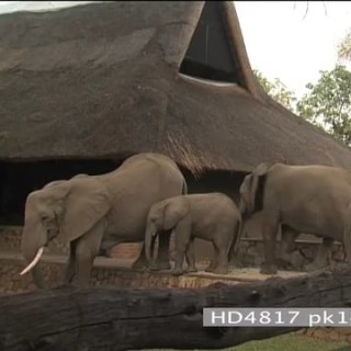 Select options DownloadYoung African elephant walking through Mfuwe lodge reception area followed by adult and calf walking together through reception area rest of herd grazing in BG courtyard