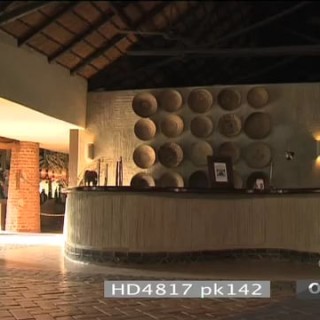 Select options DownloadAfrican elephant walking through Mfuwe lodge investigating reception desk followed by calf and younger elephants running through reception