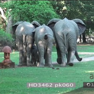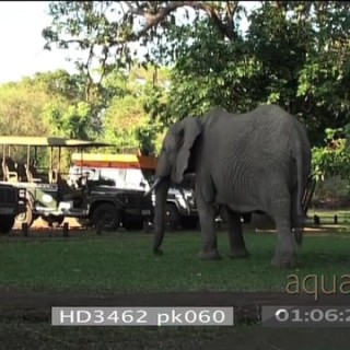 Select options DownloadAfrican elephant face zoom out to herd grazing in Mfuwe lodge courtyard 1 elephant walking into reception area