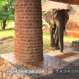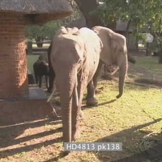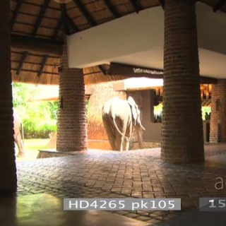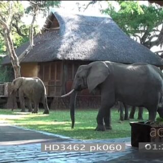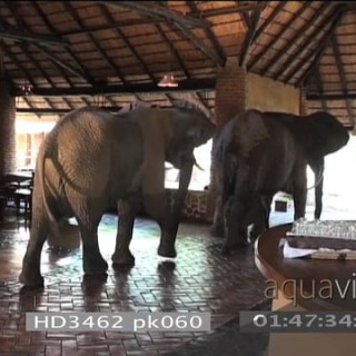 Select options DownloadAfrican elephants investigating reception area Mfuwe lodge walking out to courtyard HANDHELD