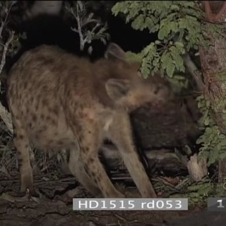 Spotted hyena caught in snare tied to bush trying to escape at night