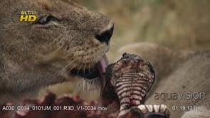 Adult female African Lioness laying down, feeding and grooming on Cape Buffalo carcass remains. MS;LATE AFTERNOON.