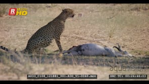 Cheetah eating the intestines of springbok kill while busy looking around