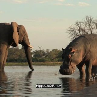 Hippo in a river and an elephant in the same shot drinking water WS