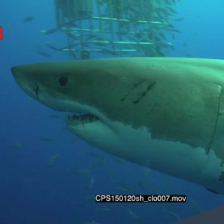 Great white shark gently swimming up to a bait then tries to bite it and fails underwater in ocean passing by camera MS HAND