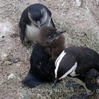 Two adult African penguins and chicks standing and preening themselves, looking around.