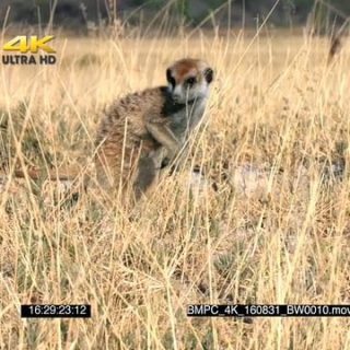 A pair of meerkats standing walking and looking a round MWS