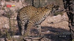 Leopard looking directly at the camera then jumps off the branch of the tree