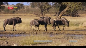 wide shot of herd of wildebeest connochsetes walking nervously at a waterhole note the one juvenile