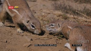 close up shot of a male cape cape ground squirrel xerus inauris sniffing another and then it runs away, note: flies on the eye