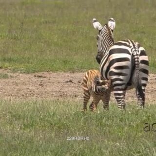 Adult Zebra back view, with a young baby foal in the Ngorongoro Crater nursing from her.