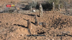 Meerkat chases cape ground squirrel into the burrow