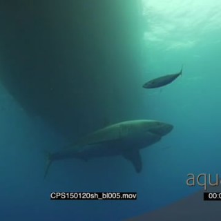 Great White Shark swimming under boat in green ocean LA UW HAND