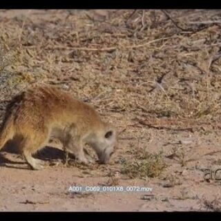 Close up tracking shot of an adult meerkat or suricate, suricata suricatta digging and searching for food