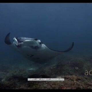 Tracking shot of female manta ray swimming towards camera and floats right above the camera