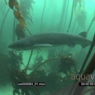 Sevengill cow shark in kelp forest underwater in ocean MLS PAN HAND