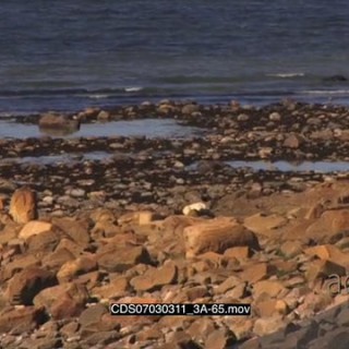 Polar bear resting on rocky shore ocean in BG