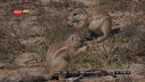 close up shot two ground squirrel xerus inauris eating. Note flies on the eyes