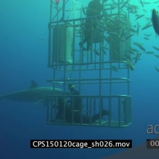 Great White Shark swimming underwater un ocean passing by divers looking at in from a cage MWS HAND