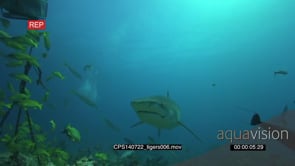 Tiger Shark swimming underwater in ocean passing by camera and diver filming it MLS PAN HAND