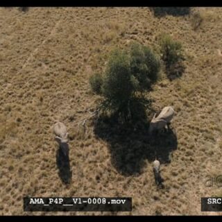 Aerial Drone African elephant herd with calves walking through bushes